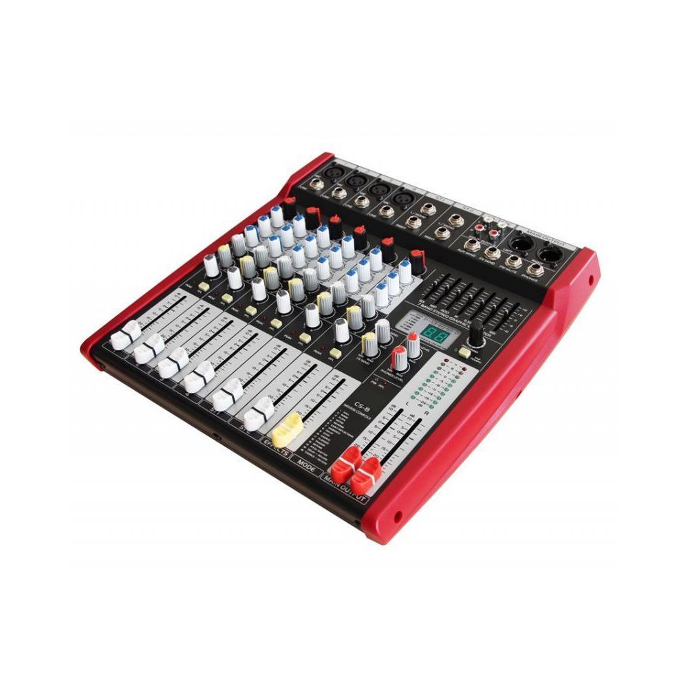 BG CS-8 – бюджетный микшерный пульт с мощным усилителем звука. Модель создана в соответствии со стандартами первоклассных консолей, что обеспечивает долгий срок службы и прекрасные акустические характеристики. Микшер станет прекрасным вариантом для аудиостудий, конференц-залов и выездных инсталляций. Основные характеристики: – корпус на 6 каналов – LR main mix – 2 Aux – 3-полосный эквалайзер – 4 монофонических входа – 2 стереофонических выхода – измерители Channel и Master – фейдеры с защитой от пыли – пиковый индикатор в каждом канале – балансные XLR выходы с электропитанием +26 dBu – 7-полосный графический эквалайзер – процессор эффектов – встроенный усилитель мощности – металлические джеки, позолоченные разъемы XLR – внешний адаптер питания Микшерный пульт обладает компактным дизайном, поэтому очень удобен при перевозке. Панель управления может наклоняться на 10 градусов в целях обеспечения наилучшего обзора, что является большим преимуществом.
