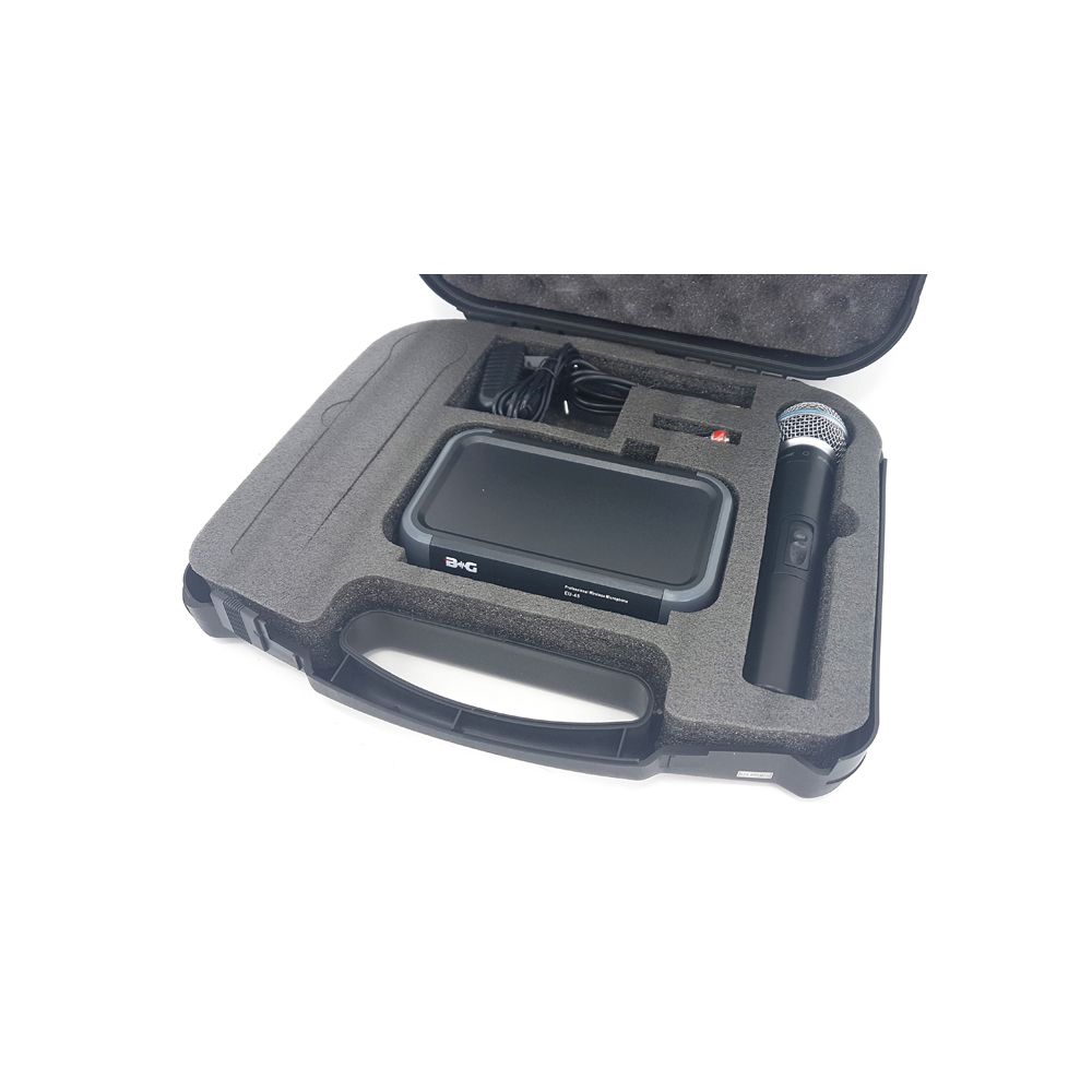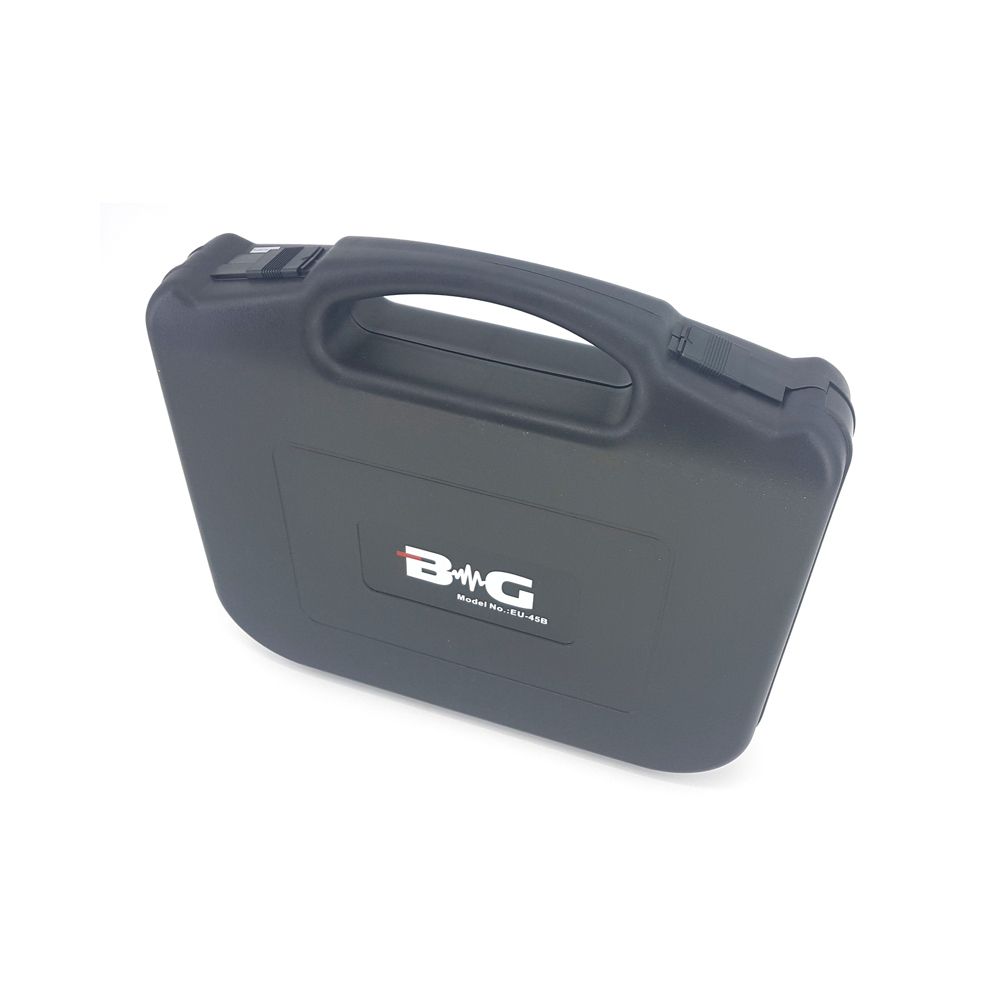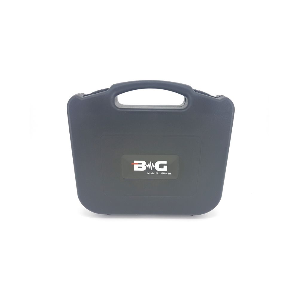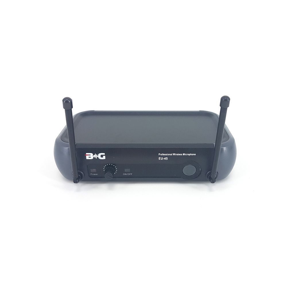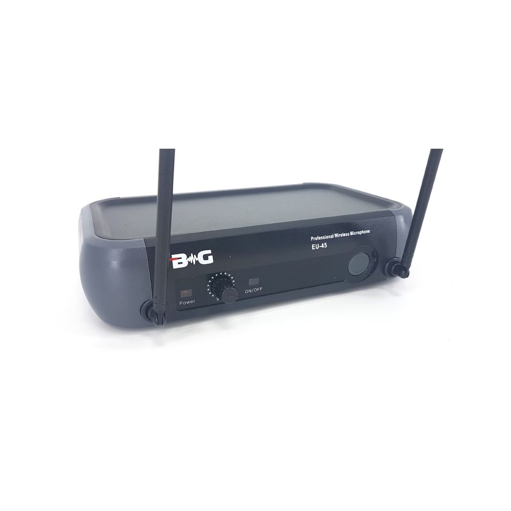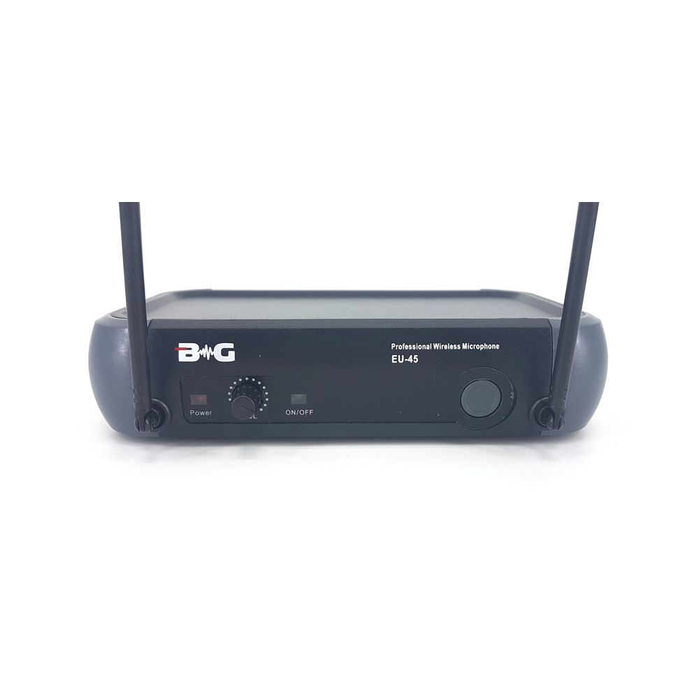 BG EU-45B представляет собой качественную вокальную радиосистему, которая работает в широком звуковом диапазоне. Модель можно использовать как на открытых площадках, так и на закрытых мероприятиях.   Комплектация: 1. Приемник 2. Ручной микрофон Приемник: – индикатор переключателя ON/OFF – регулятор громкости – RF-индикатор – переключатель ON/OFF – антенна приемника – разъем кабеля питания – балансный выходной разъем – выходной аудиоразъем – регулятор шумоподавителя Микрофон: – капсюль – индикатор низкого заряда – переключатель питания – отсек для элементов питания