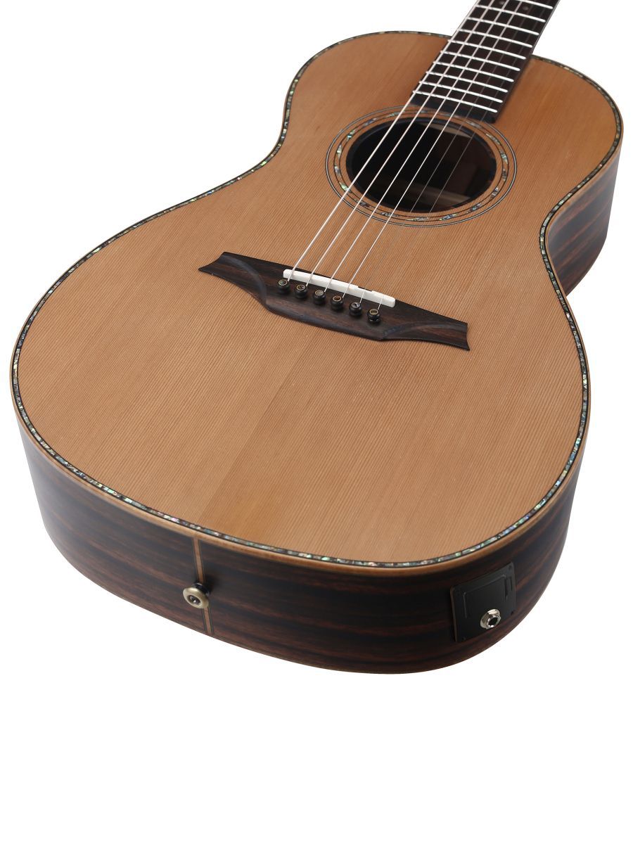 Серия: Rocky Mountain Форма корпуса: Parlor Мензура: 632,4 мм (24 29/32") Ширина грифа у шеи: 47 мм (1 27/32") Верхняя дека: цельный красный кедр Нижняя дека и обечайка: цельный макассарский эбен Гриф / накладка грифа: махагони с двумя эбеновыми вставками / макассарский эбен Анкерный стержень: двухсторонний Инкрустация на грифе: перламутр Лого на голове: гора Бромо Оформление резонаторного отверстия: «Ковбойская веревка» Бридж: "Орлиное крыло", черное дерево Amara Оформление грифа и пятки: гора Бромо Лады: Jumbo, 20 ладов Верхний и нижний порожки: кость Колки: винтажные "Bromo", античная латунь Электроника: Fishman "Sonitone" Отделка: матовая В комплекте: чехол