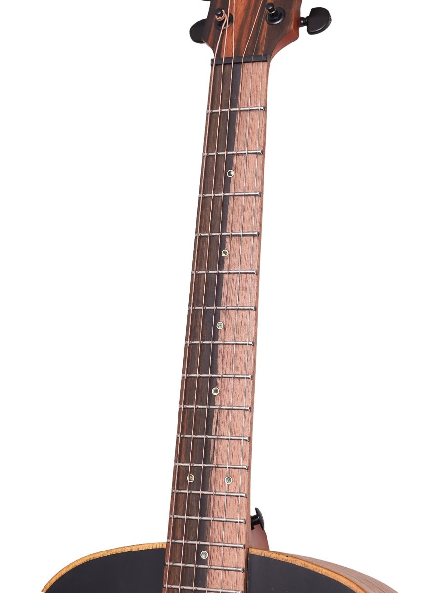 Bromo BAT8MEBK Гитара электроакустическая Mini Jambo, верхняя дека: цельный махагони, нижняя дека и обечайка: орех, гриф: махагони с двумя эбеновыми вставками, накладка грифа: двухцветный макассарский эбен, двухсторонний анкер, колки: литые "Mt. Bromo", черные, электроника: предусилитель с 4-полосным эквалайзером Bromo BZP1, матовая с черной верхней декой