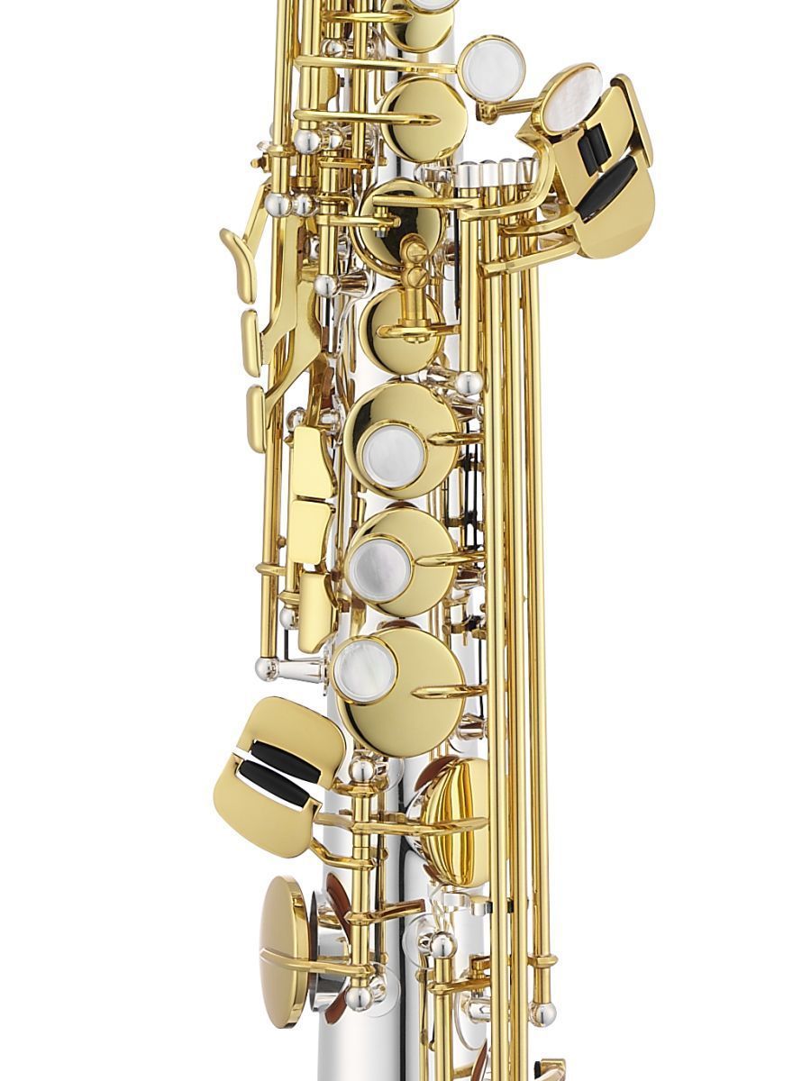 Jupiter JSS1100SGQ Саксофон сопрано Bb, прямая и изогнутая эска "Sona-Pure", клапан верхнего F#, клапан верхнего G, регулируемый упор для большого пальца, материал - латунь, посеребренный, покрытие клапанов золотой лак, облегченный кейс JKC-SS39FQ